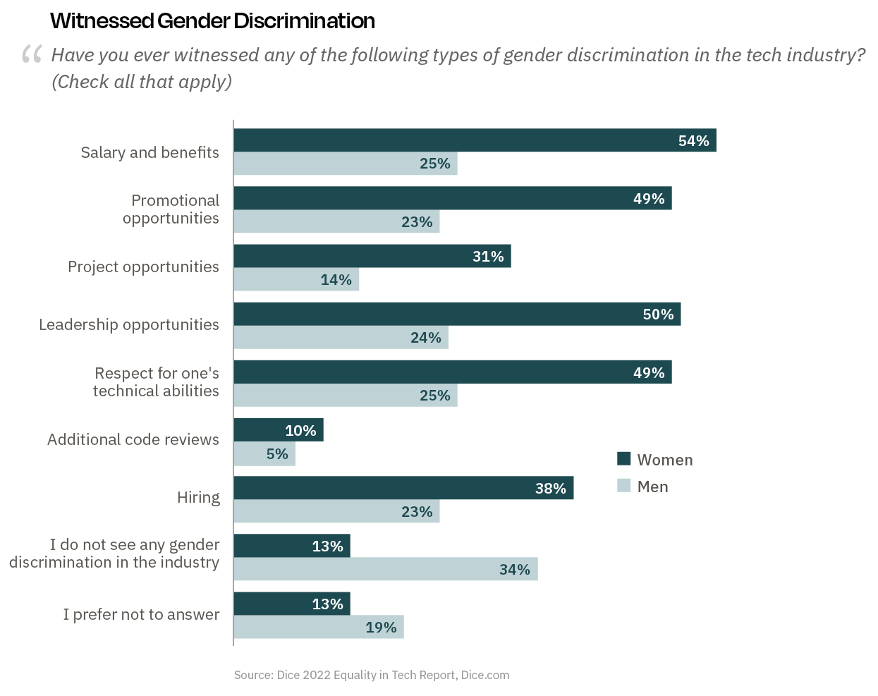 Technologists who identify as women were more likely to say they’d witnessed gender discrimination in salary and benefits, promotions, project and leadership opportunities, respect for technical abilities, additional code reviews and hiring. In many instances, the gap was quite stark: for example, 54% of those identifying as women said they’d witnessed salary-based gender discrimination, compared to 25% of men. Only 13% of those identifying as women said they’d never witnessed either gender discrimination in the tech industry, versus 34% of men.
