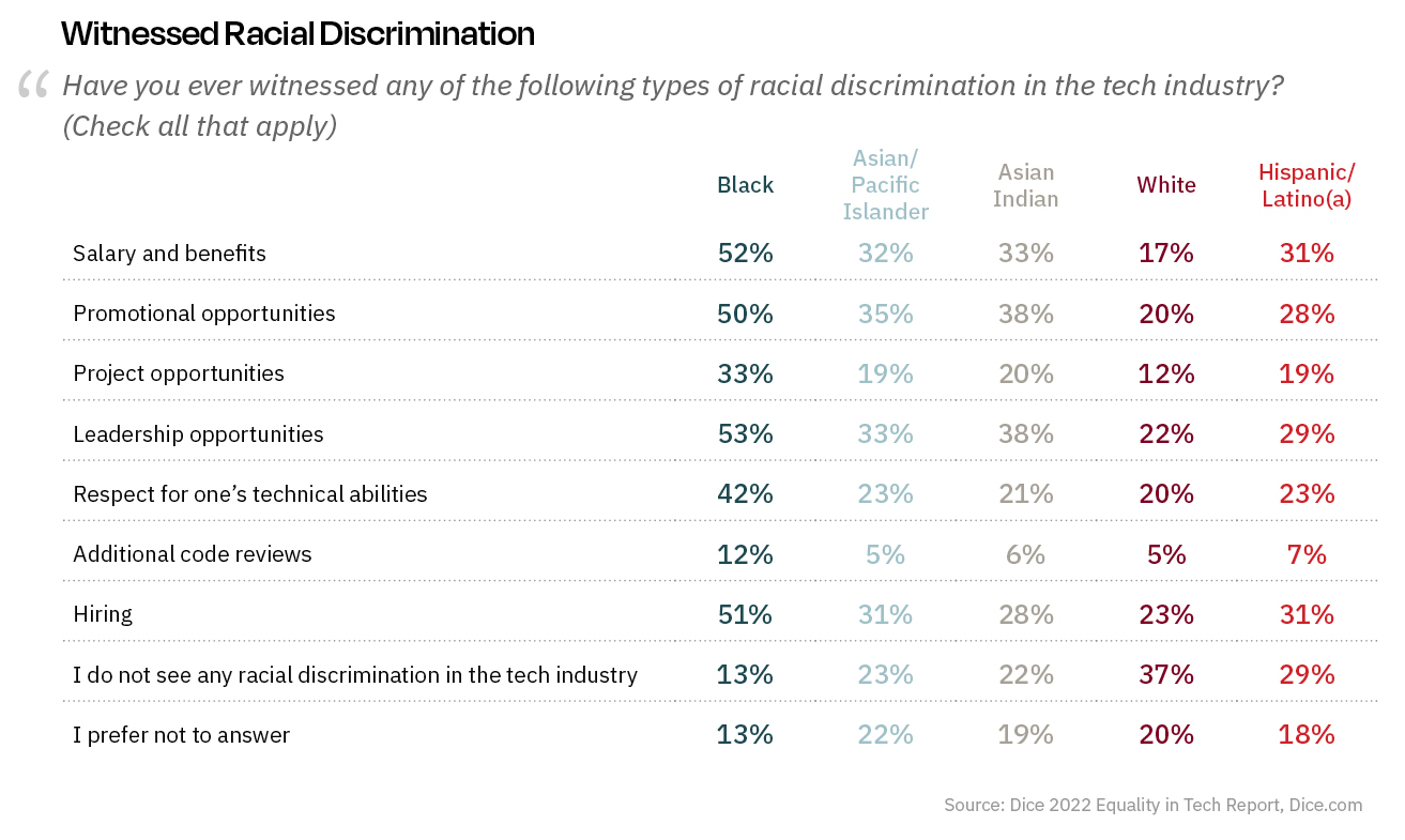 Discrimination occurs in many different forms. To combat it, it is important to understand where technologists are witnessing discrimination within their organizations. Salary and benefits, promotional opportunities, leadership opportunities and respect for one’s technical abilities are common instances where discrimination is currently witnessed at a higher rate across racial and gender groups.